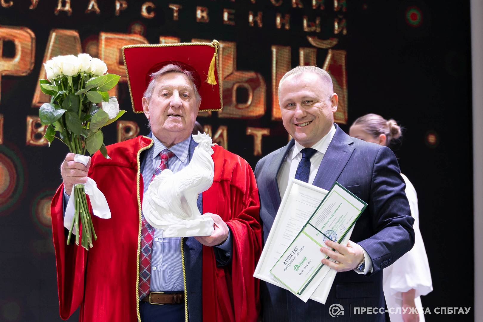 В завершение встречи состоялась торжественная церемония. За выдающийся вклад в сельскохозяйственную науку и многолетнее плодотворное сотрудничество Владимиру Ивановичу было присвоено звание «Почетный профессор СПбГАУ»