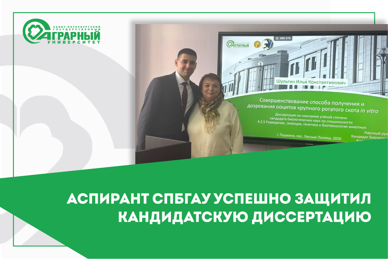 В Санкт-Петербургском государственном аграрном университете состоялось значимое событие для аграрной науки. Ассистент кафедры генетики, разведения и биотехнологии животных, директор учебно-тренингового центра по трансплантации эмбрионов и специалист научного центра университета Илья Шульгин успешно защитил диссертацию на соискание учёной степени кандидата биологических наук. Научное исследование на тему «Совершенствование способа получения и дозревания ооцитов крупного рогатого скота in vitro» проводилось под руководством кандидата биологических наук Любови Ротарь.