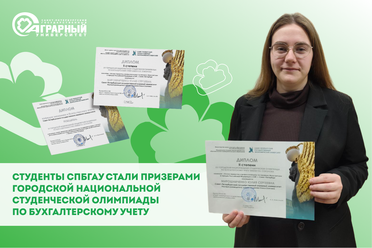 Инновационные подходы к обучению и высокий уровень подготовки студентов Института экономики и управления Санкт-Петербургского государственного аграрного университета вновь подтвердили свою эффективность. Студентка Юлия Мирошниченко под руководством заведующего кафедрой экономики и бухгалтерского учета Олеси Андреевой успешно выступила на XV Городской национальной студенческой олимпиаде по бухгалтерскому учету имени Я.В. Соколова.