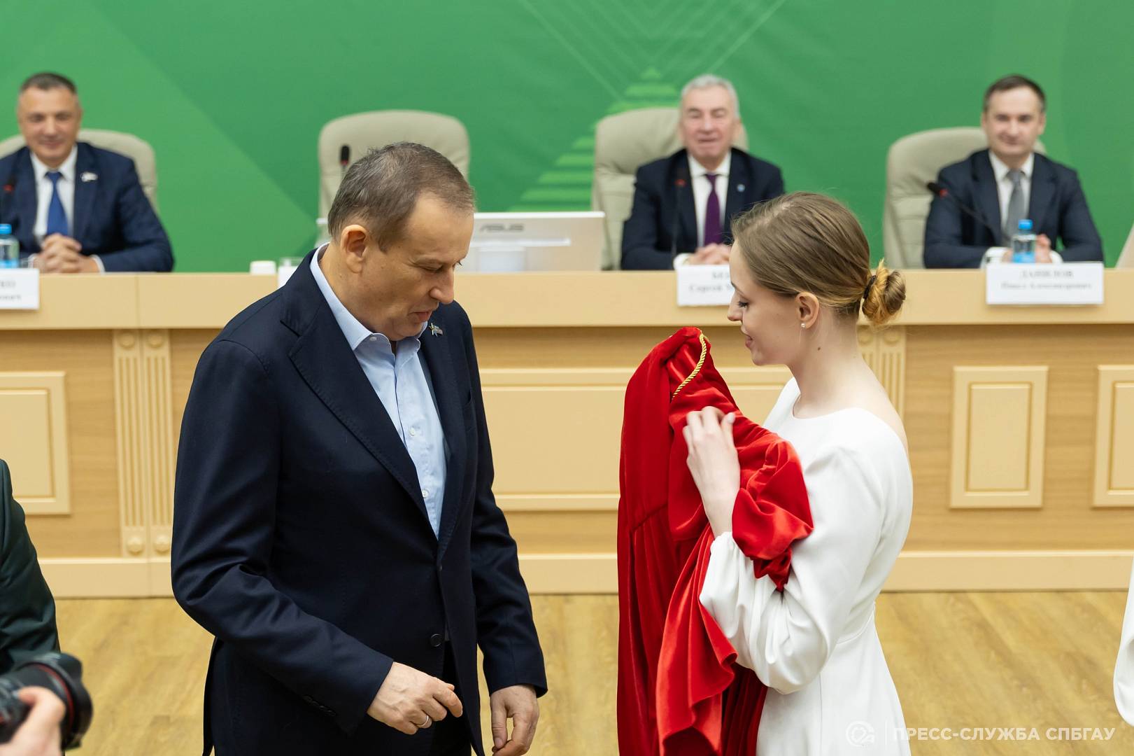 «С 2024 года Санкт-Петербургский государственный аграрный университет открывает агротехнологические классы по новой модели, активно взаимодействующей с предприятиями агропромышленного комплекса. До 2030 года мы планируем открыть 160 агроклассов», – отметил ректор СПбГАУ. В завершении своего выступления Виталий Морозов в присутствии гостей и членов Ученого совета университета вручил губернатору диплом «Почетного профессора» и мантию Санкт-Петербургского государственного аграрного университета.